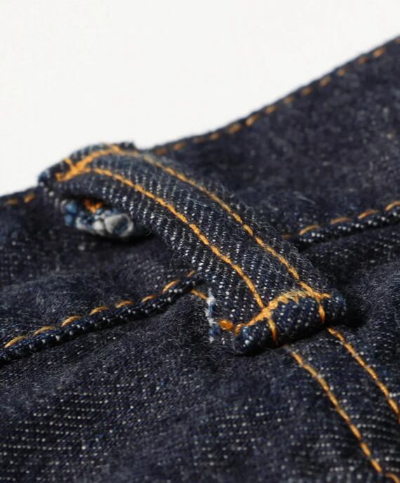 通常のホワイトの緯糸と異なり、茶綿を用いたことで生地にほんのりとした温かみと奥行きが生まれ、インディゴが落ちていく過程で独特のムラ感や土っぽさを帯びた表情に変化していきます。穿き込むほどに現れる粗野で立体的な色落ちは、ヴィンテージ好きにも愛される「育てがい」のあるデニムです。