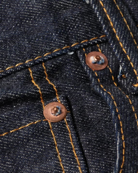 隠しリベットや色落ちするコアヤーン縫製糸、ディアスキン革パッチなど、本格的なヴィンテージディテールも併せ持ったアイテムで