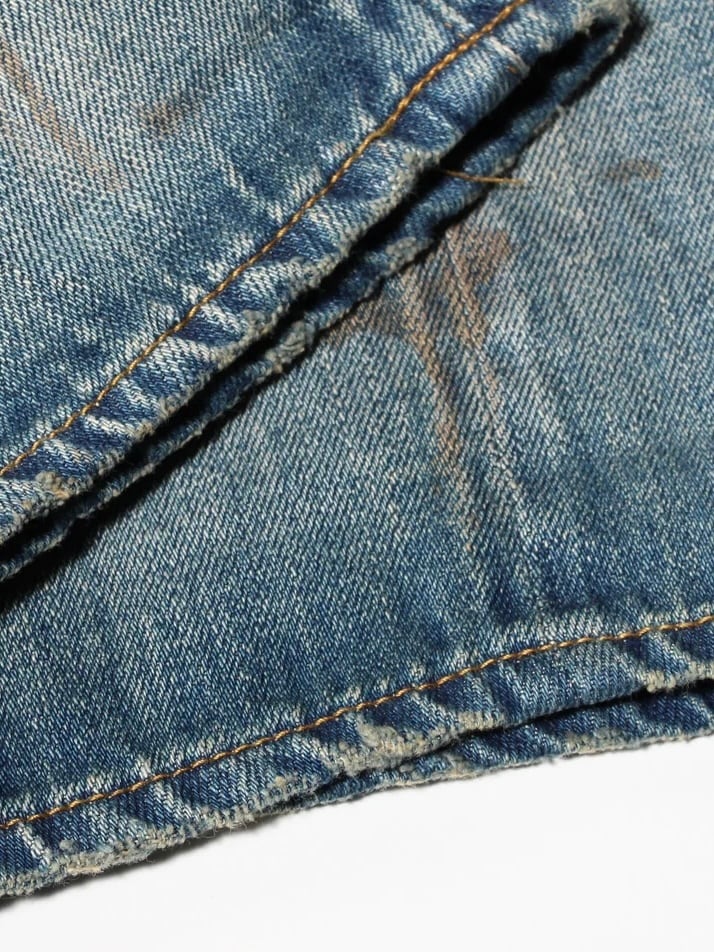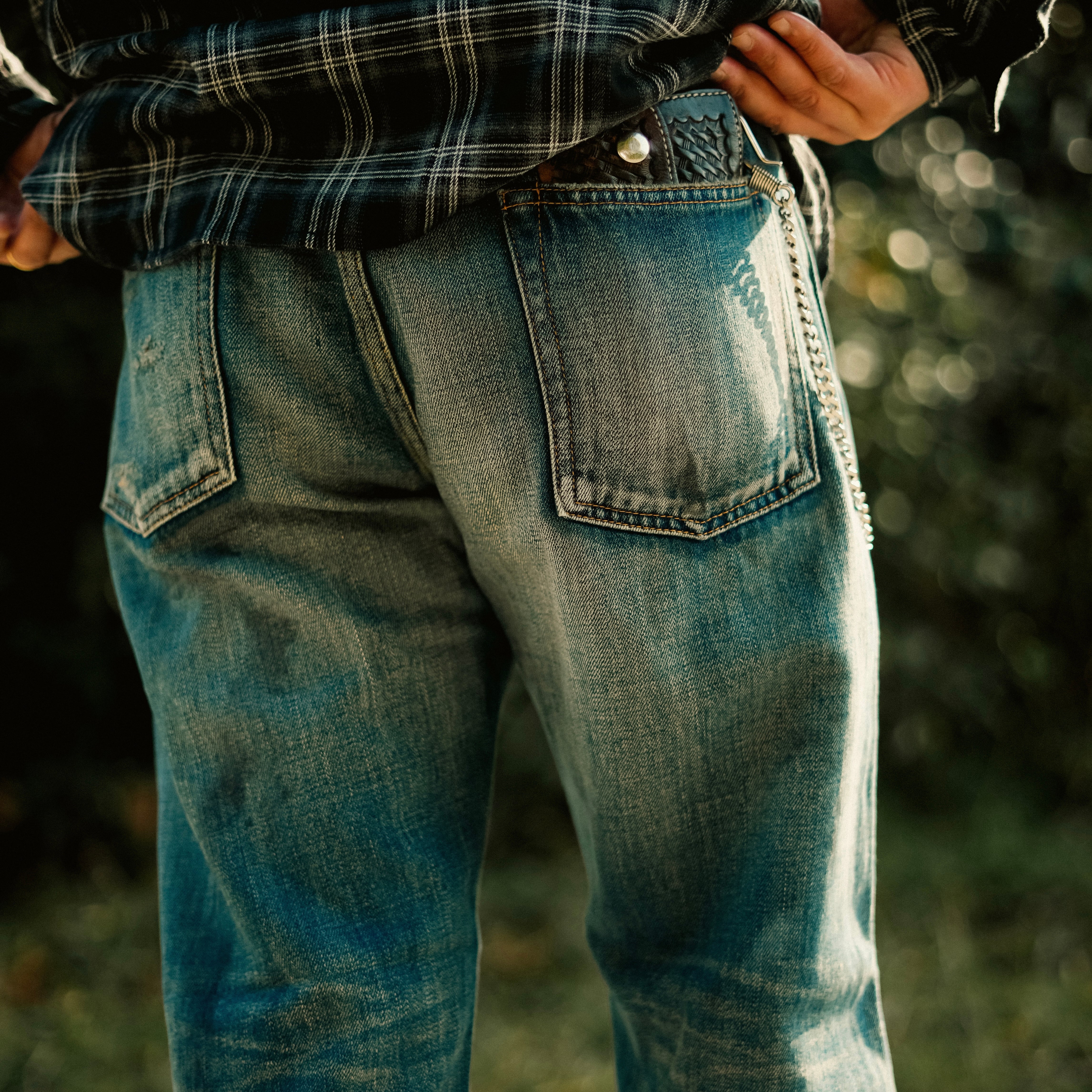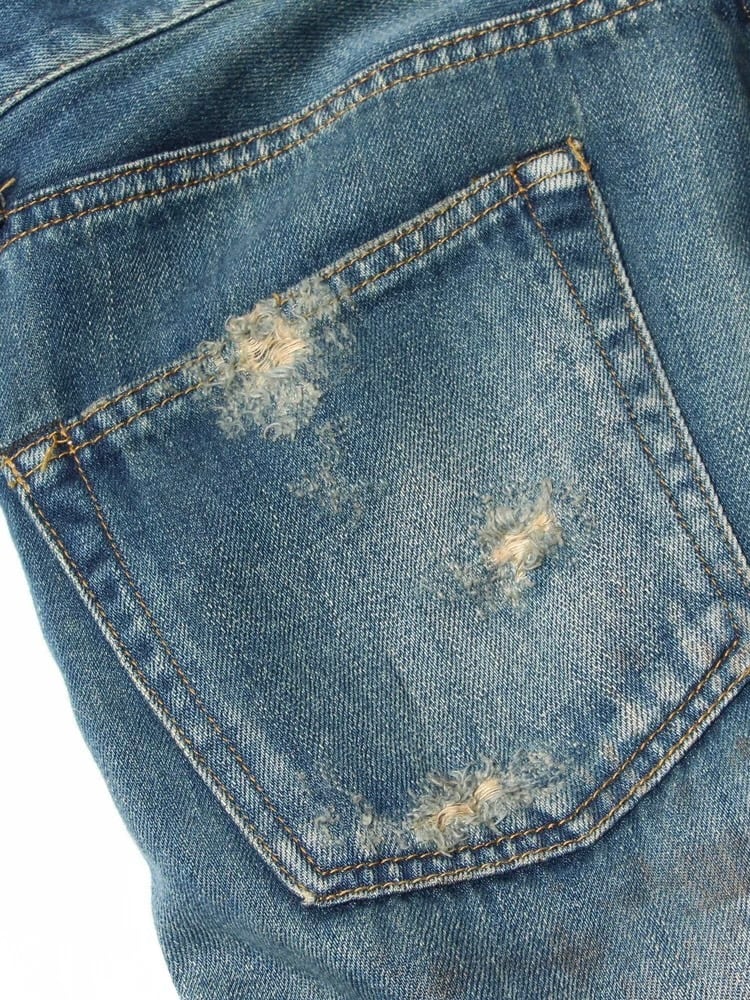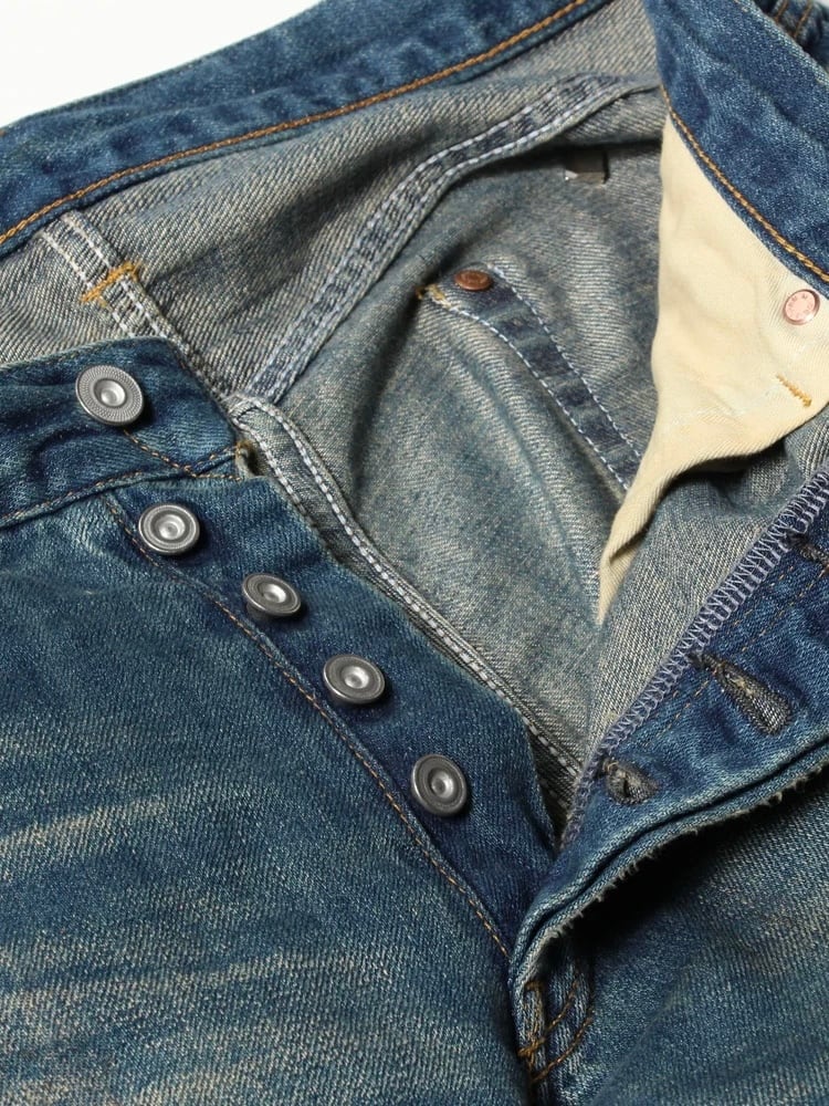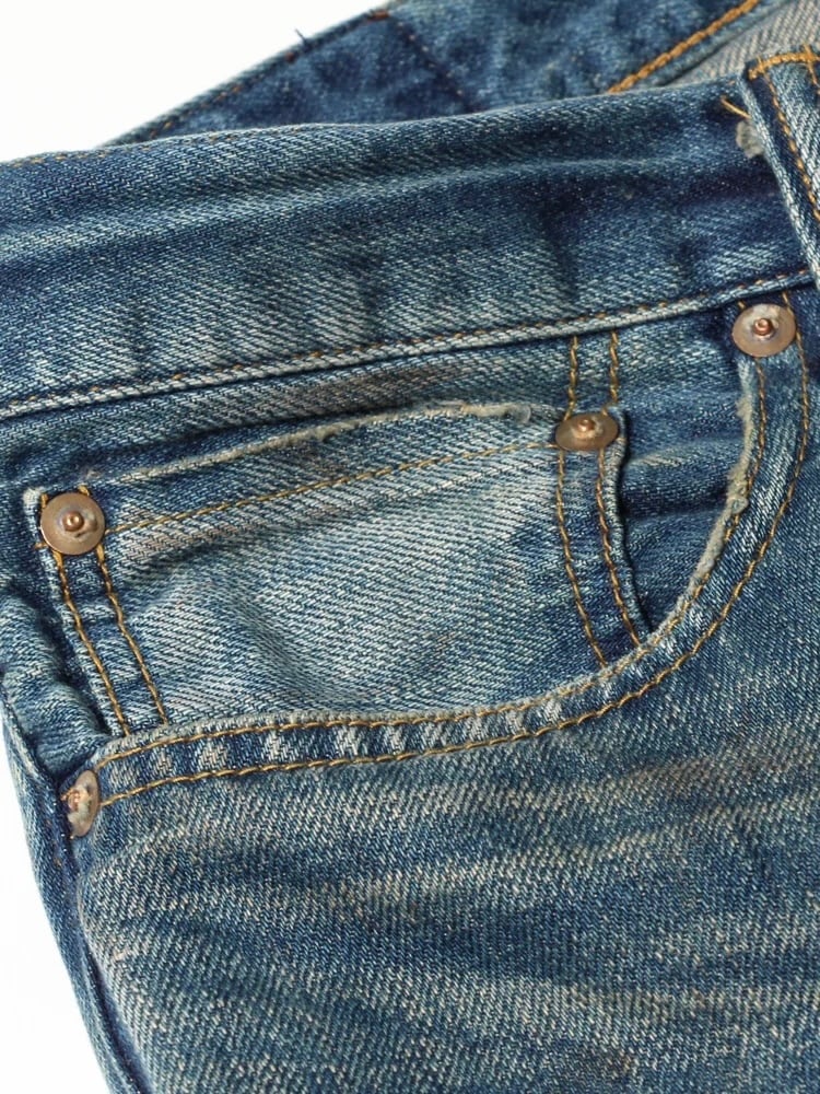 モモ部分やバックポケット、ポケット口など、ジーンズ着用を続けると自然に色落ちする部分をナチュラルに再現。穿き始めから何年も穿き込んだ風合いでお楽しみいただけます。