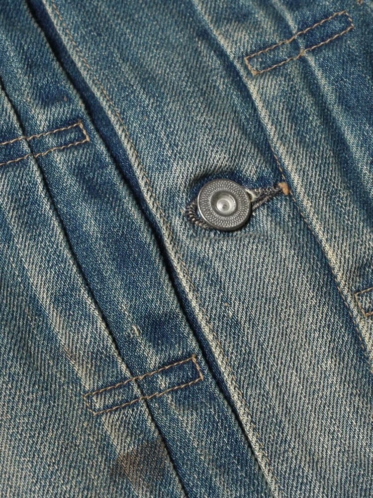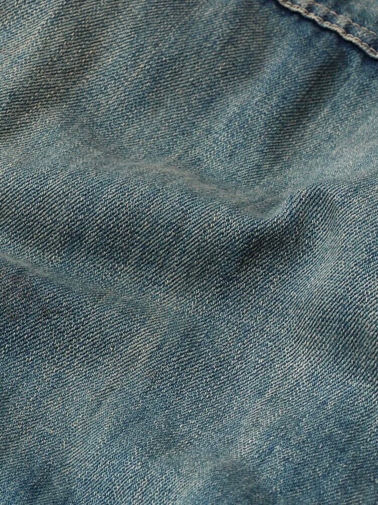デニム加工の技術により、リアルなエイジングを再現したデニムジャケット。通常の着用では色落ちさせるのは難しいデニムジャケットを加工職人の手により、長年着用したかのような風合いを作り出した逸品です。擦りによる色落ちの個所や加減など、長年の経験によって施されるデニム加工の技術は職人技と呼べる芸術にも似た日本が誇る手仕事です。