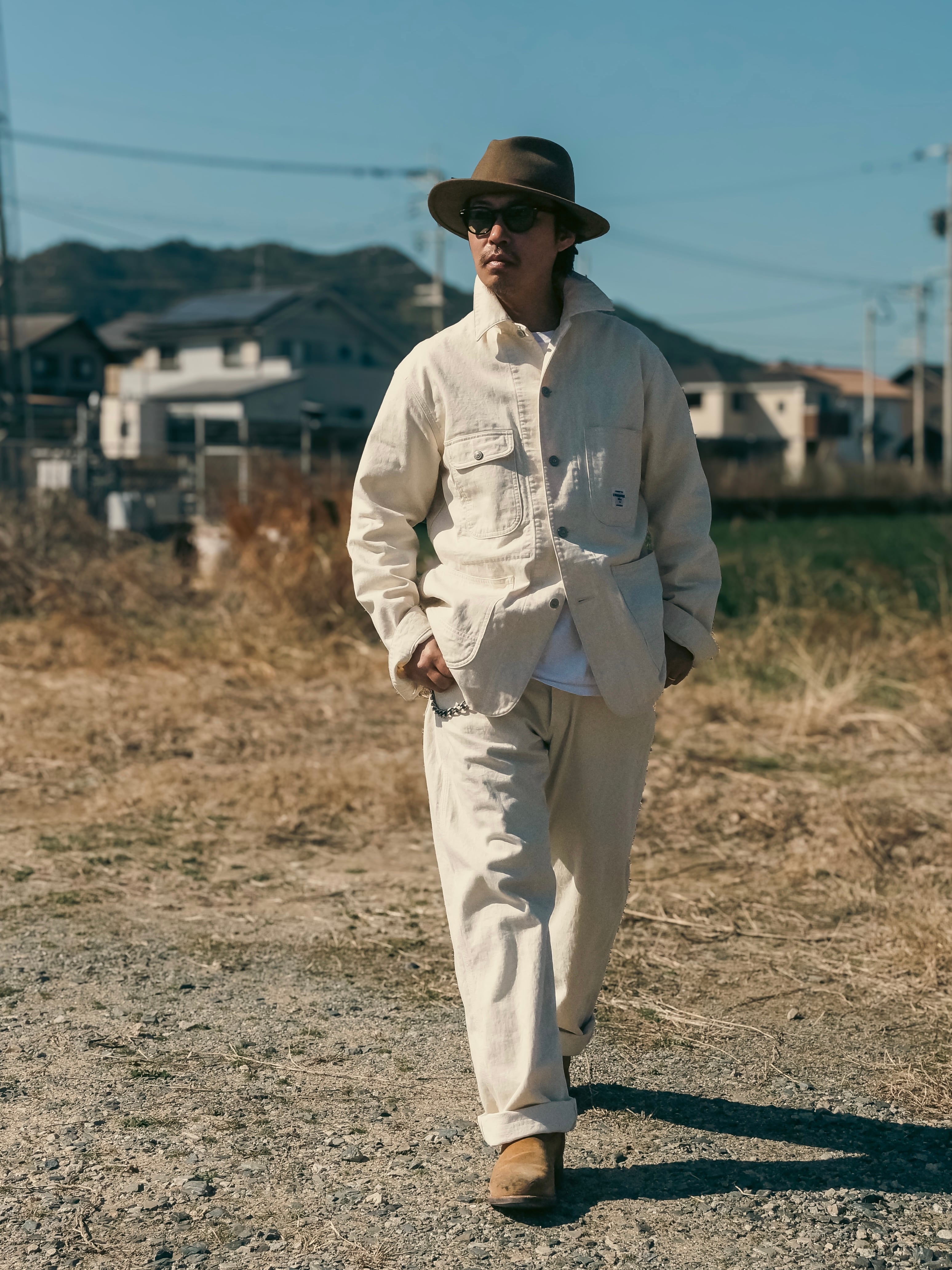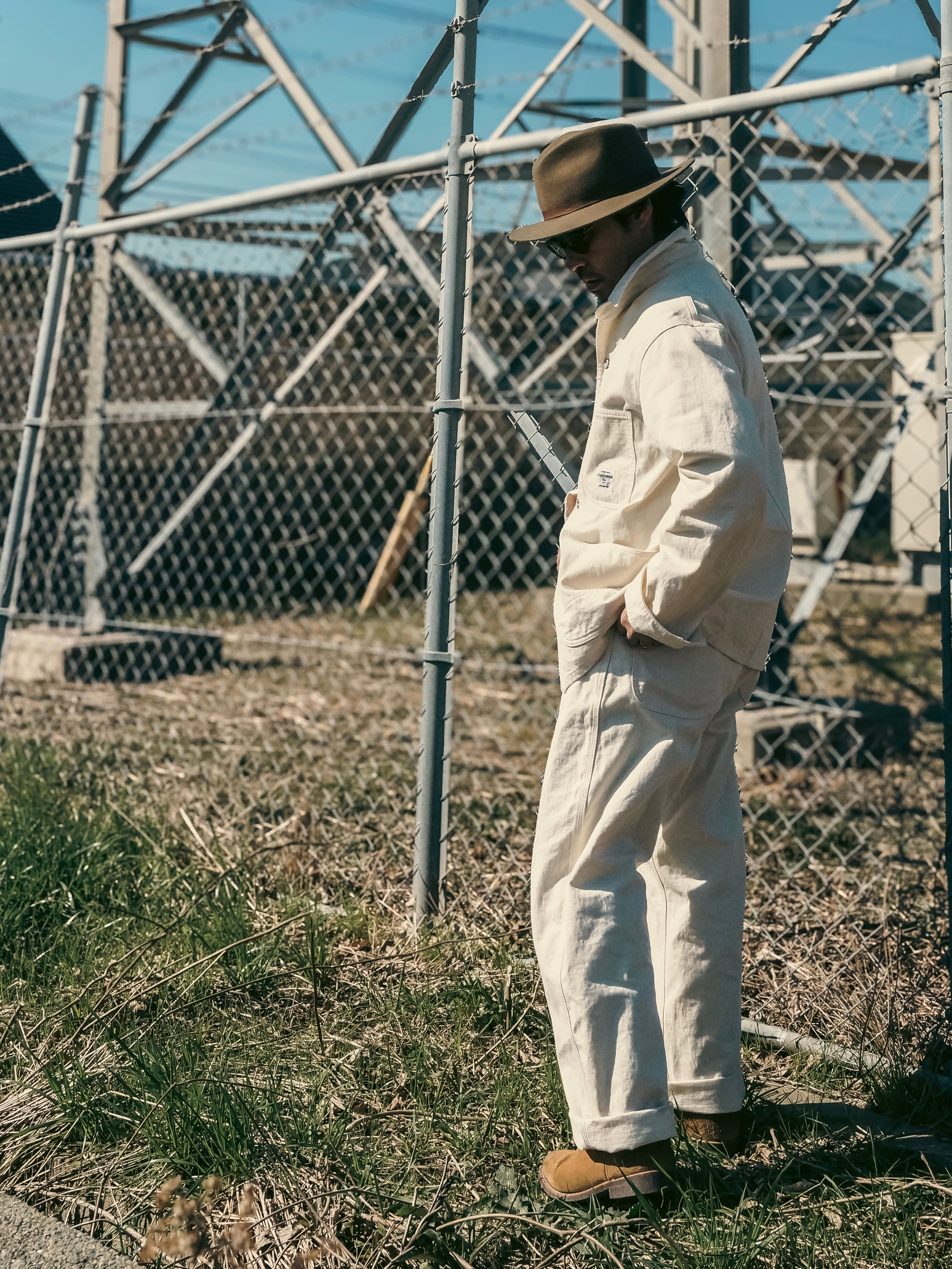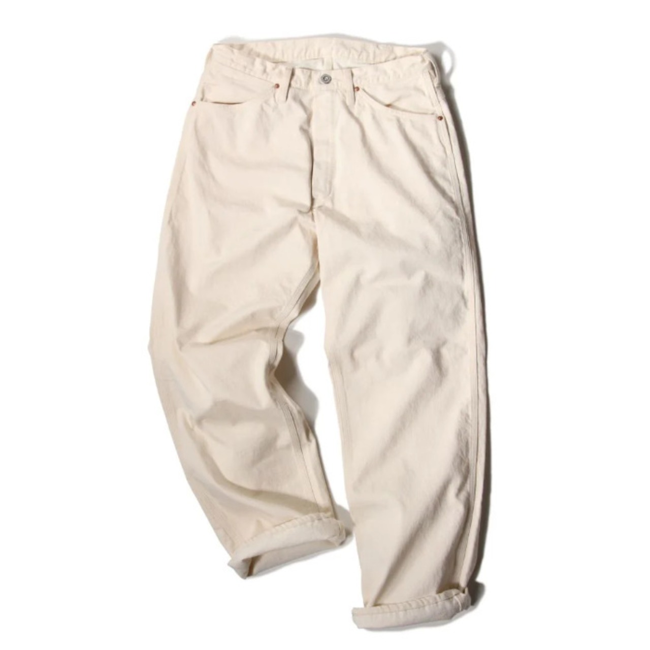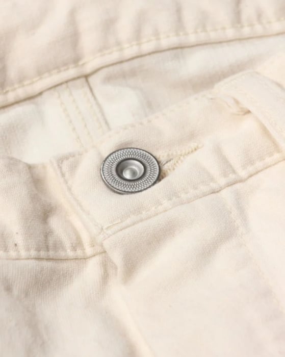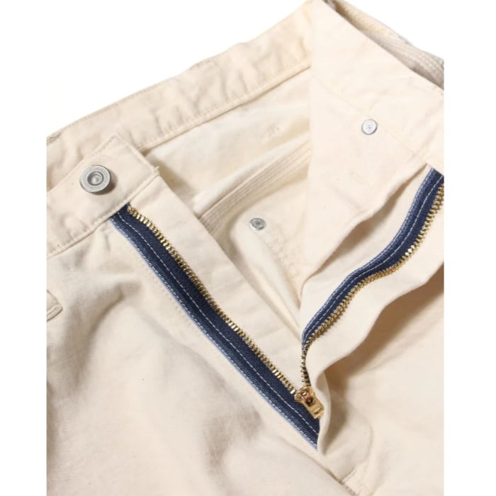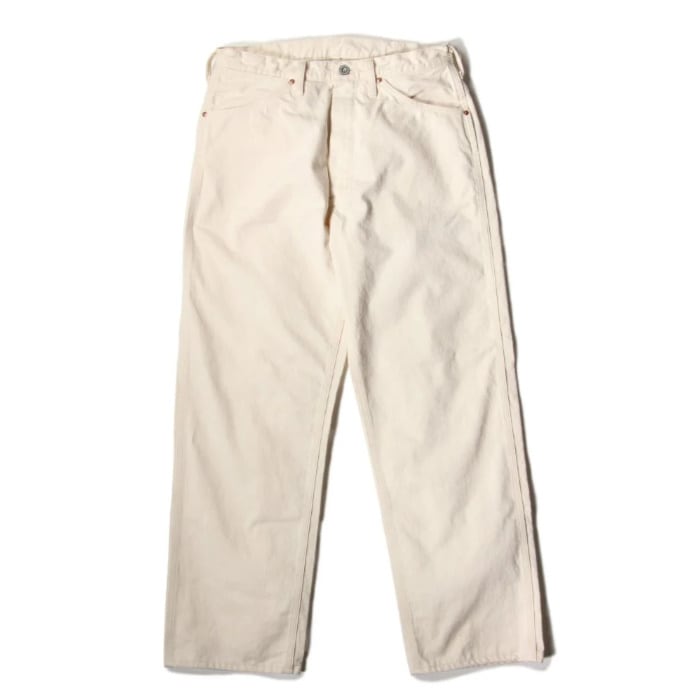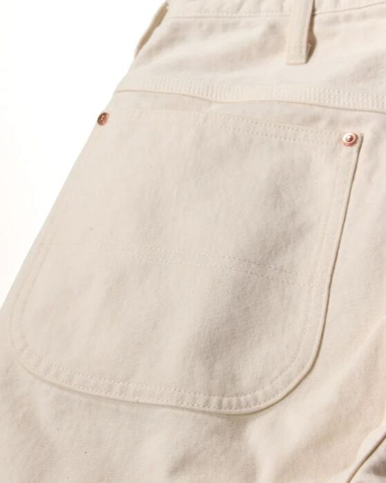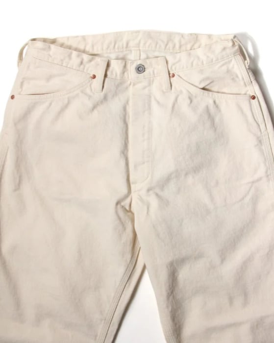オフホワイトのカラーはクリーンな印象でありながら、着用や作業によって付く汚れや擦れも、ひとつの“経年変化”として表情に変わっていきます。デニム同様、時間とともに自分だけの一本へと育っていくのもこのパンツの魅力です。真っ白ではない、やや生成りがかった色味がヴィンテージワークの空気感を引き立てます。